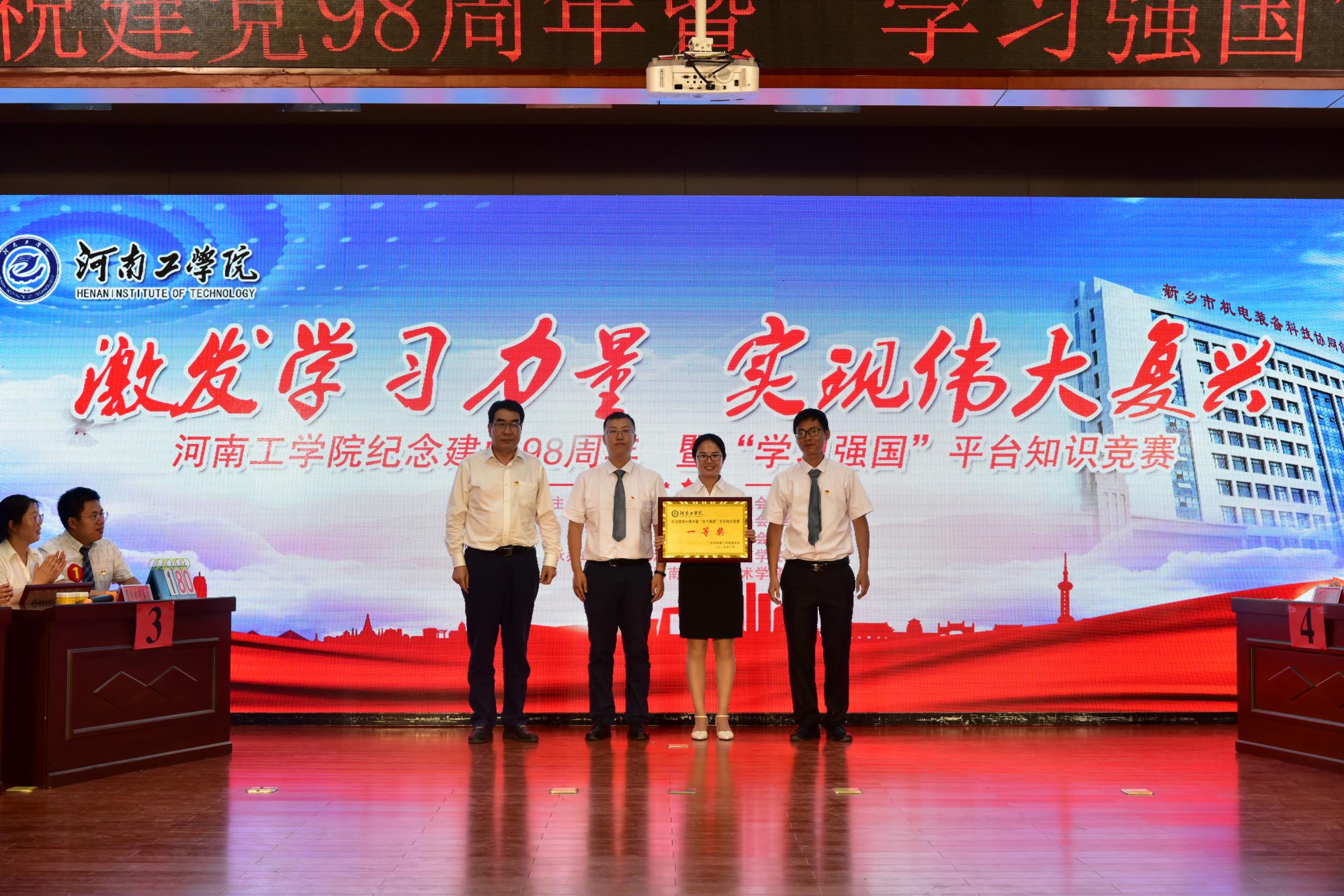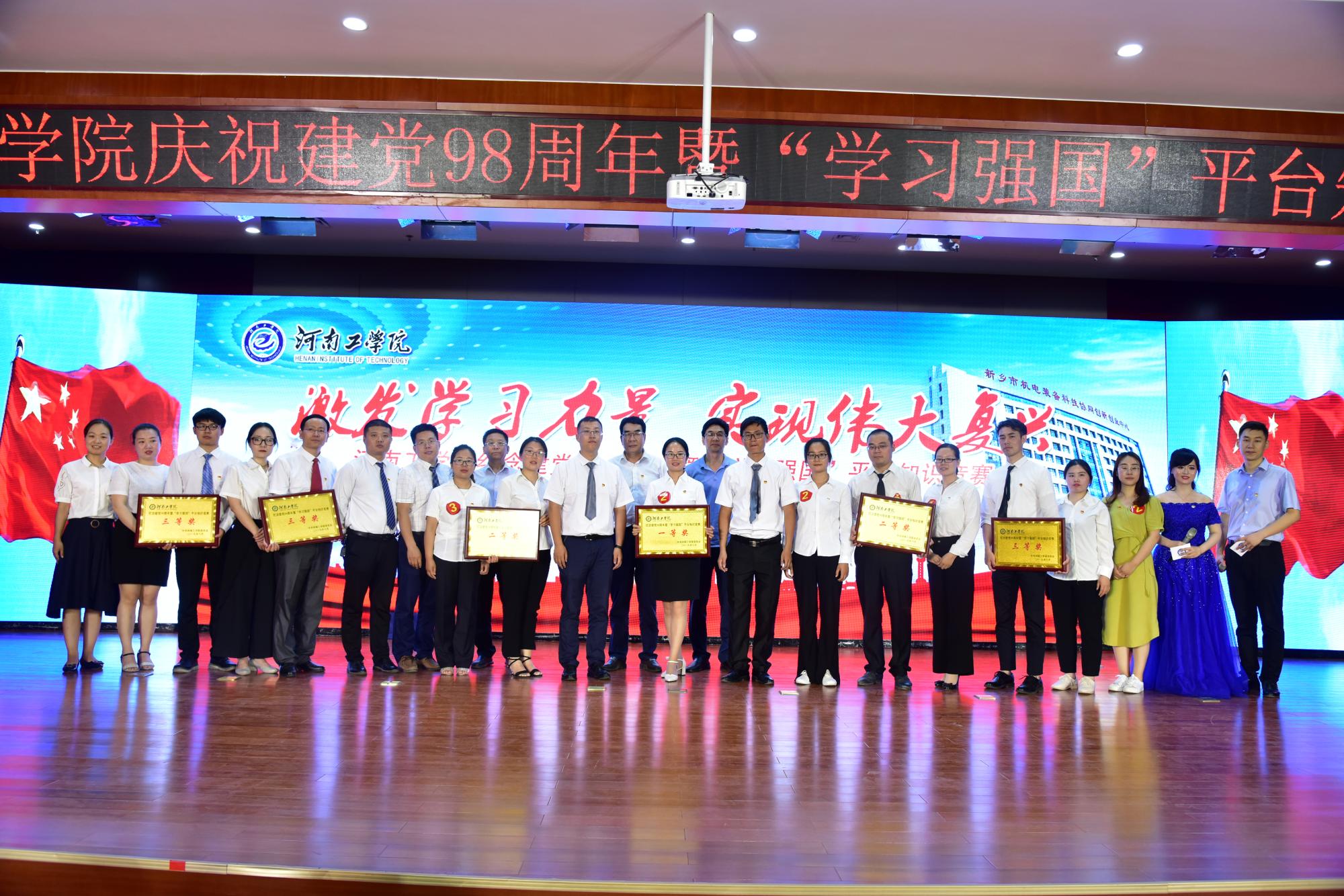 6月13日,由校党委办公室、组织部、宣传部联合举办,电子信息工程学院、艺术设计学院党总支承办的“纪念建党98周年暨‘学习强国’平台知识竞赛”决赛在创新楼二楼报告厅举行。校领导赵学通、李贵敏、张国臣与全校各党总支书记及教工、学生党员代表观看了比赛。
