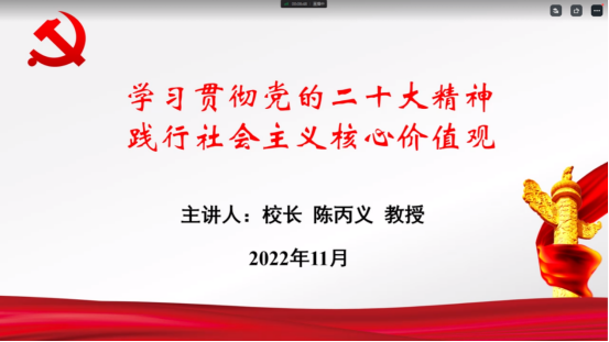 为深入学习贯彻党的二十大精神,切实加强新形势下党员发展对象的教育培养工作,根据2022年第2期党员发展对象培训班部署安排,校党委书记赵学通、校长陈丙义分别以专题党课形式为全体党员发展对象宣讲二十大精神。因疫情原因,专题党课采用线上形式进行,300余名师生学员参加培训。